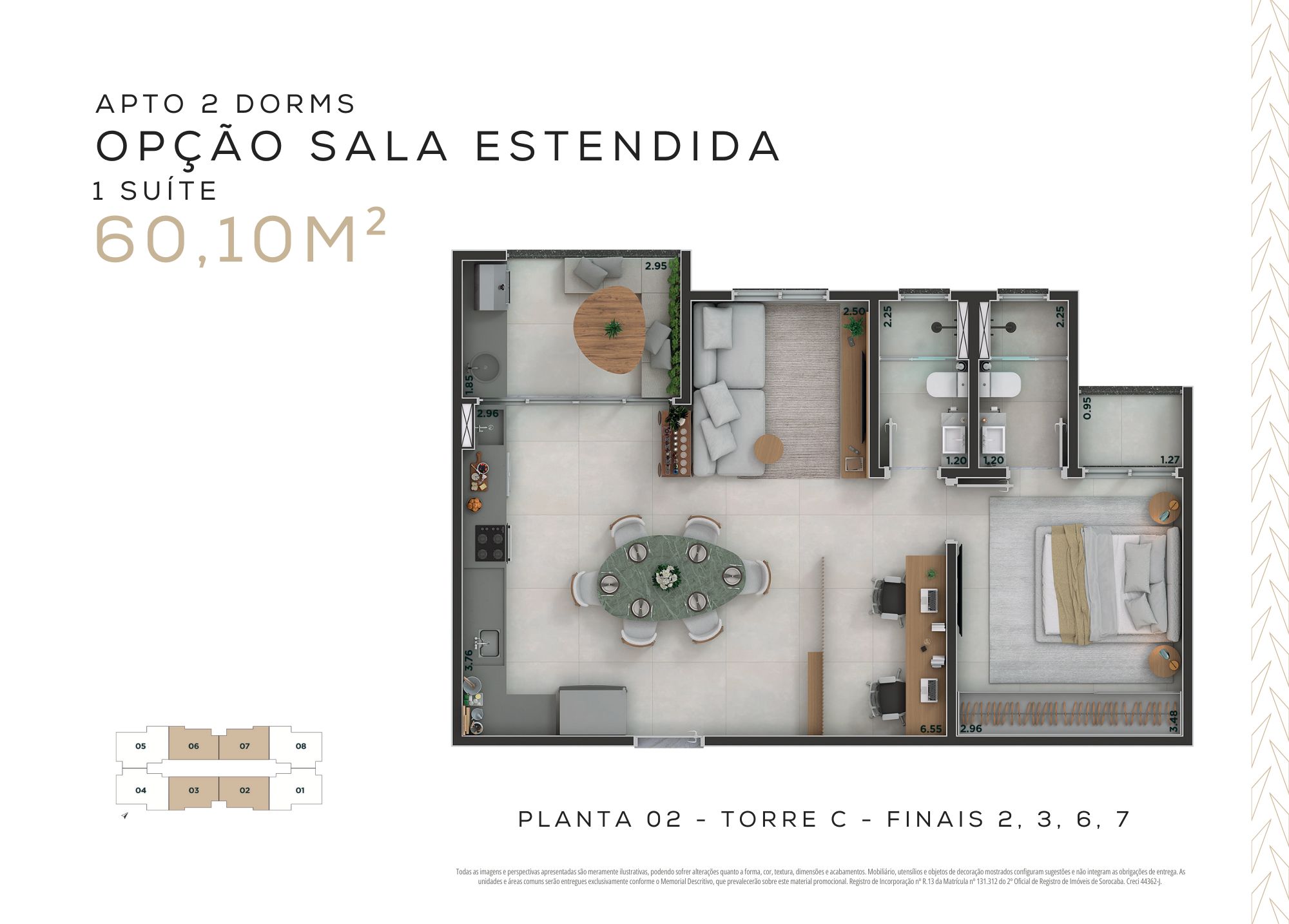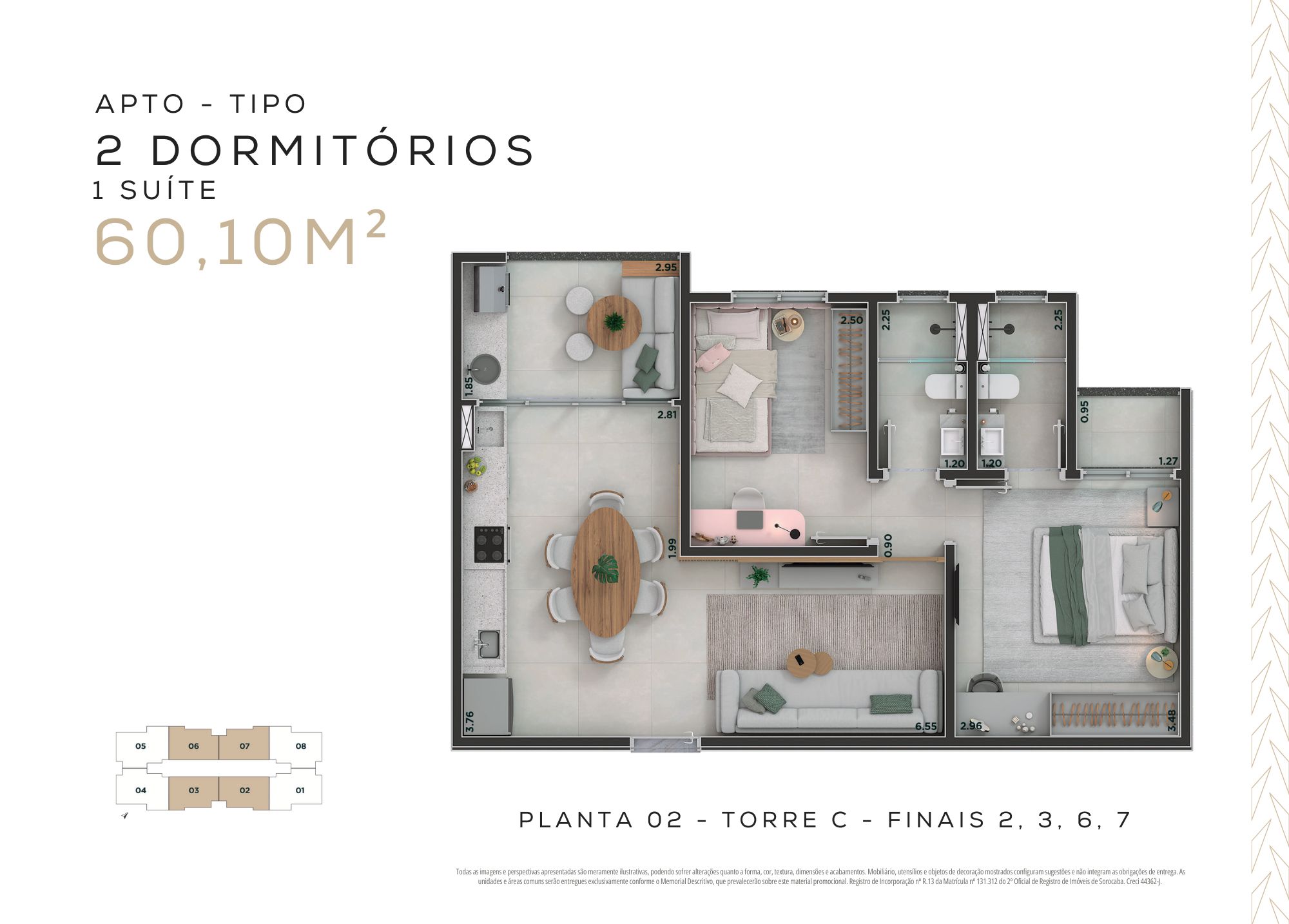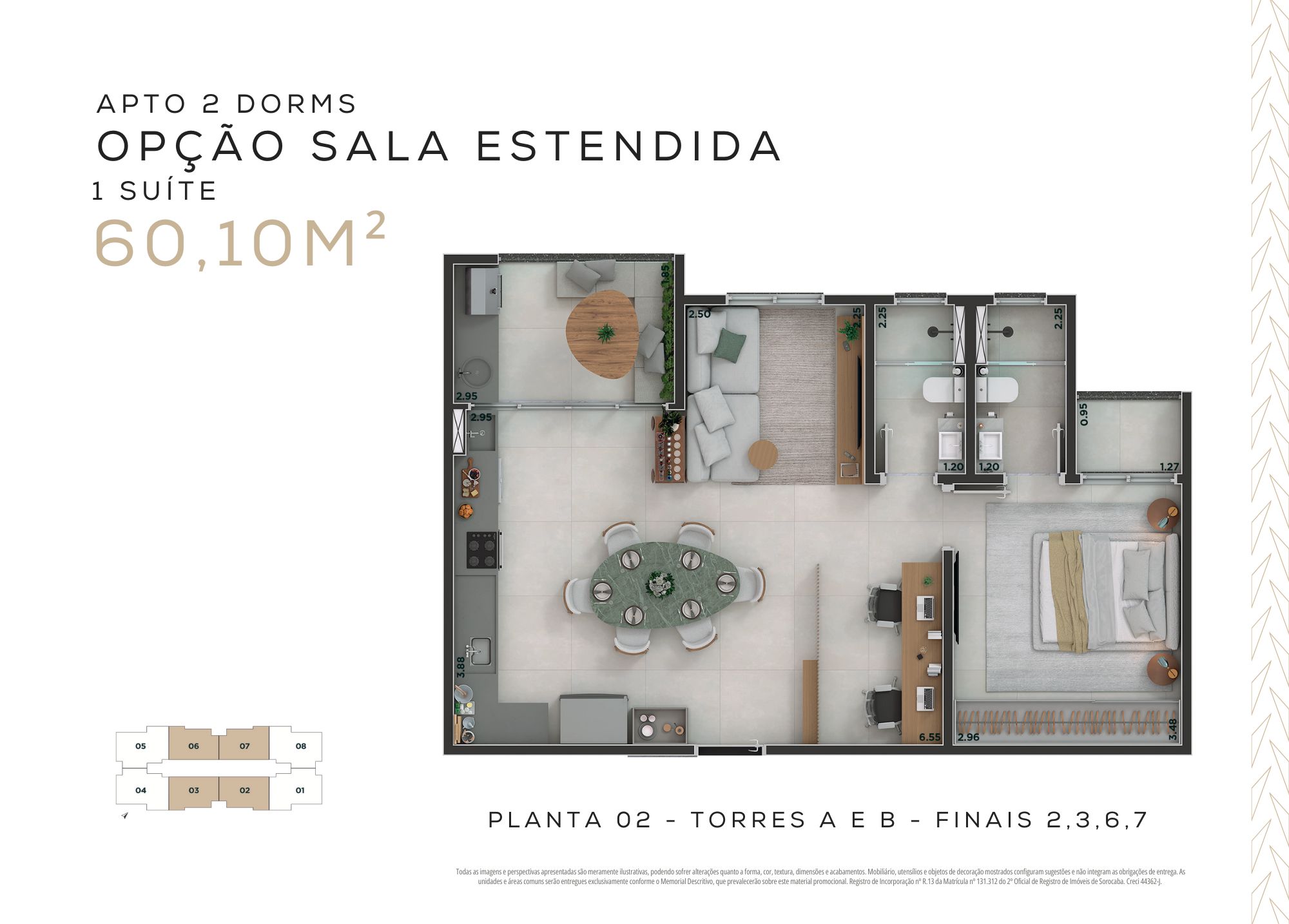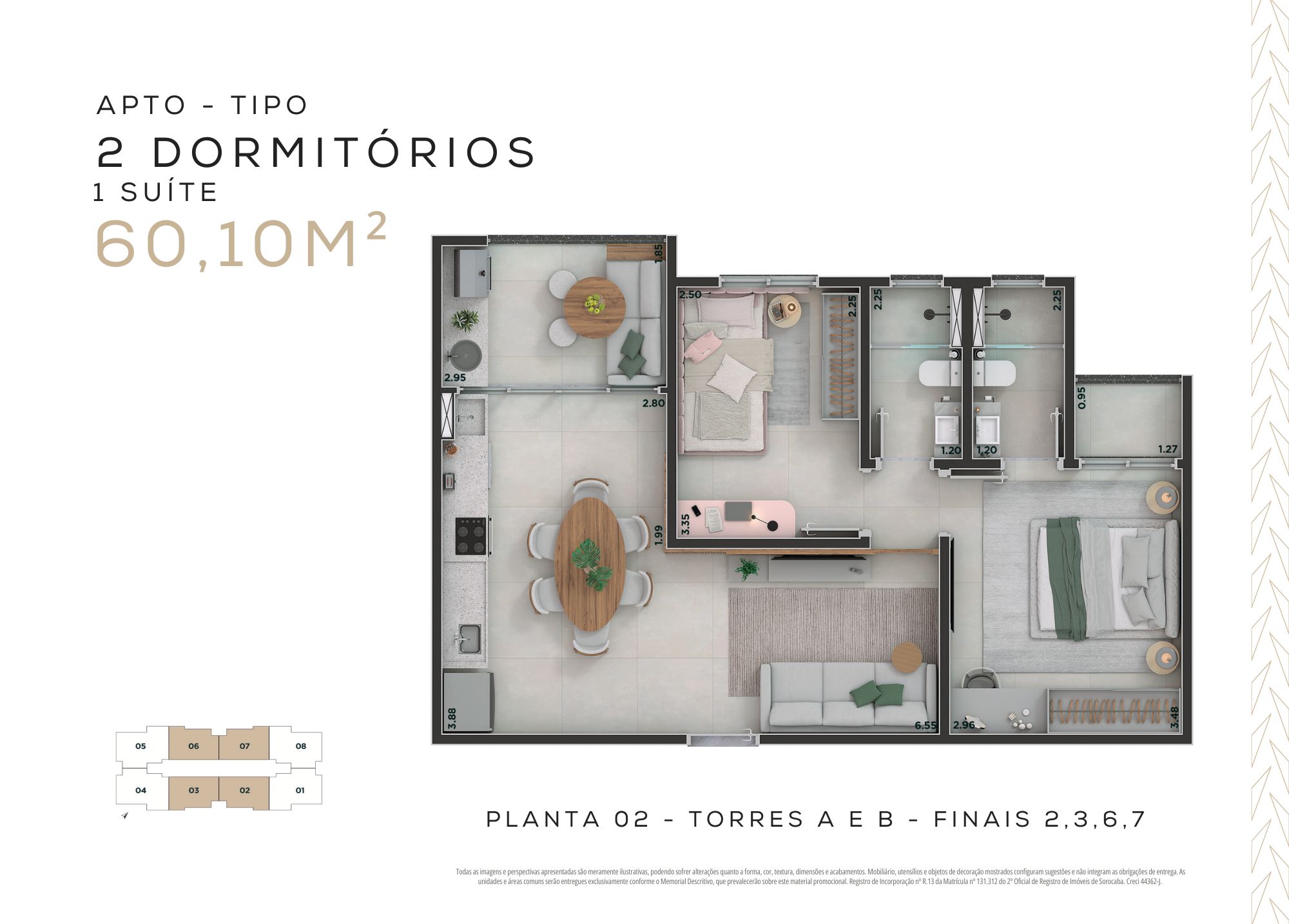 60,10m² – 2 dormitórios, sendo 1 suíte