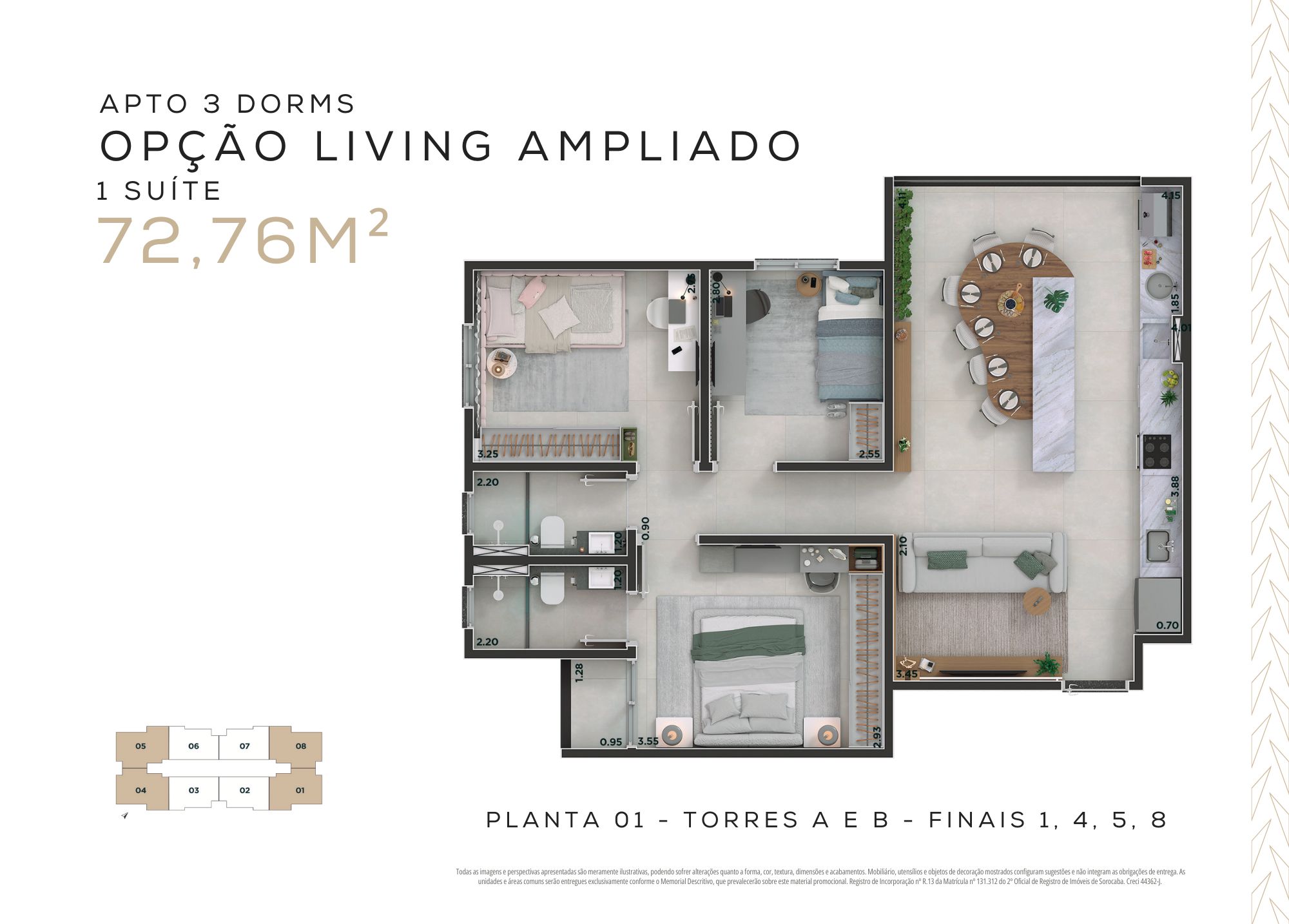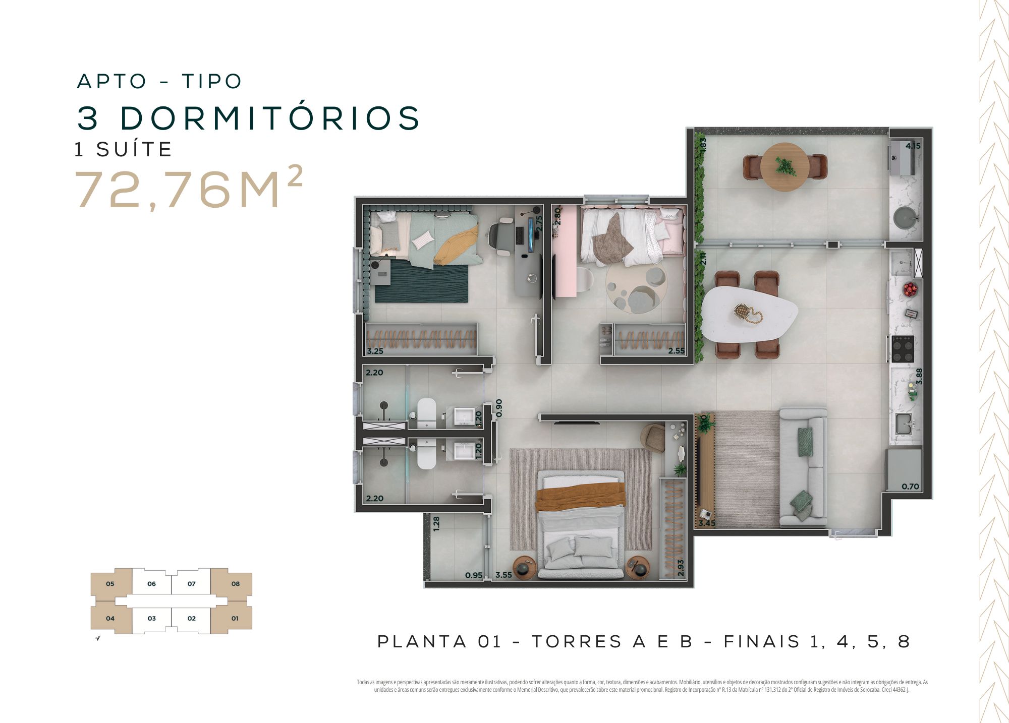 72,76m² – 3 dormitórios, sendo 1 suíte